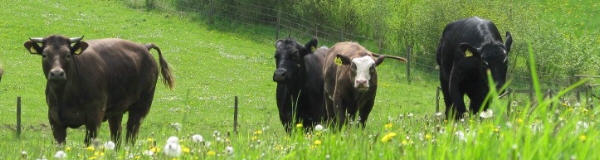 Die Kühe mit ihren Kälbern und ein Bulle ziehen im Sommer über die Weiden.. Die Wintermonate verbringen Sie in einem großen Laufstall